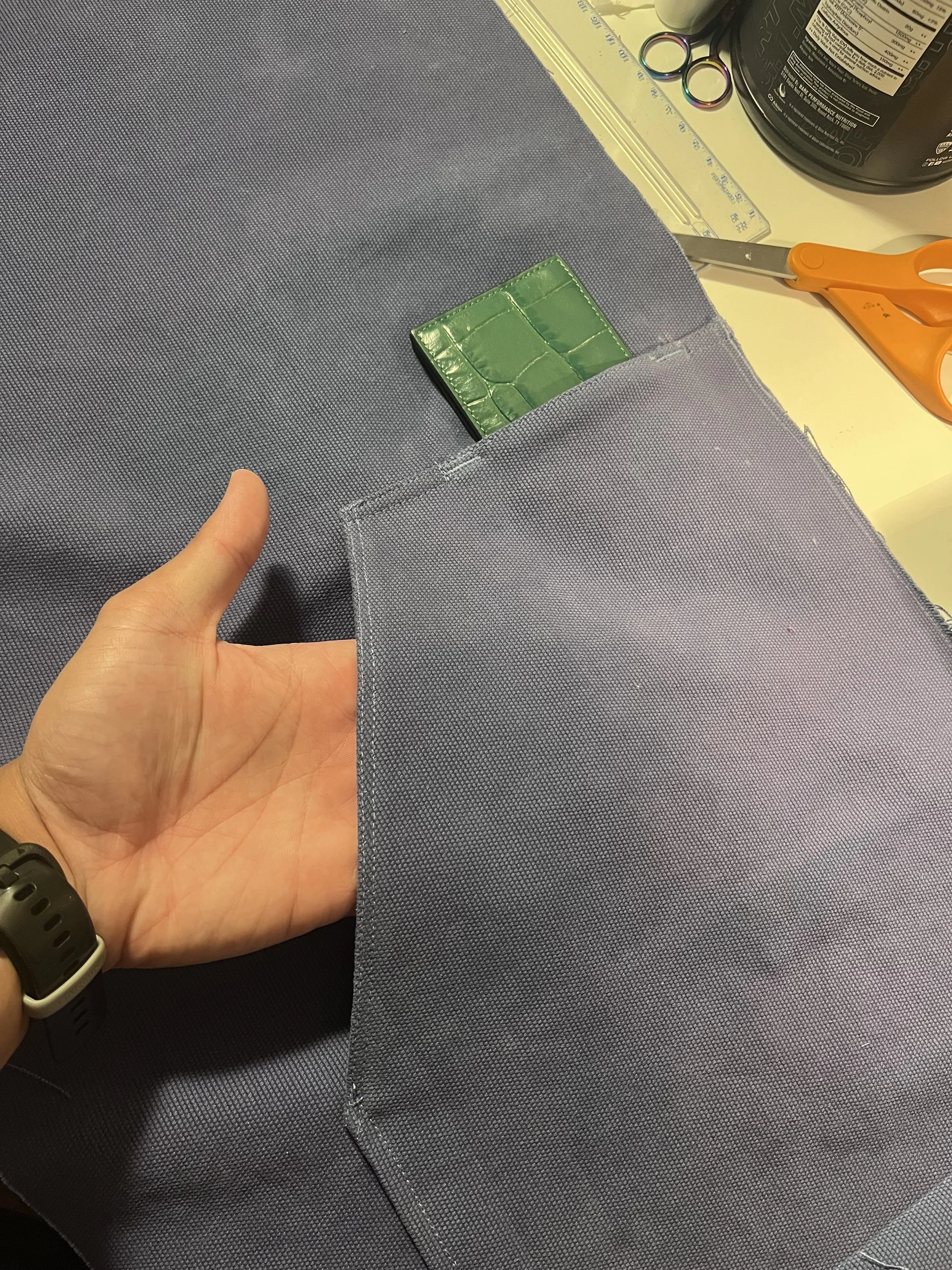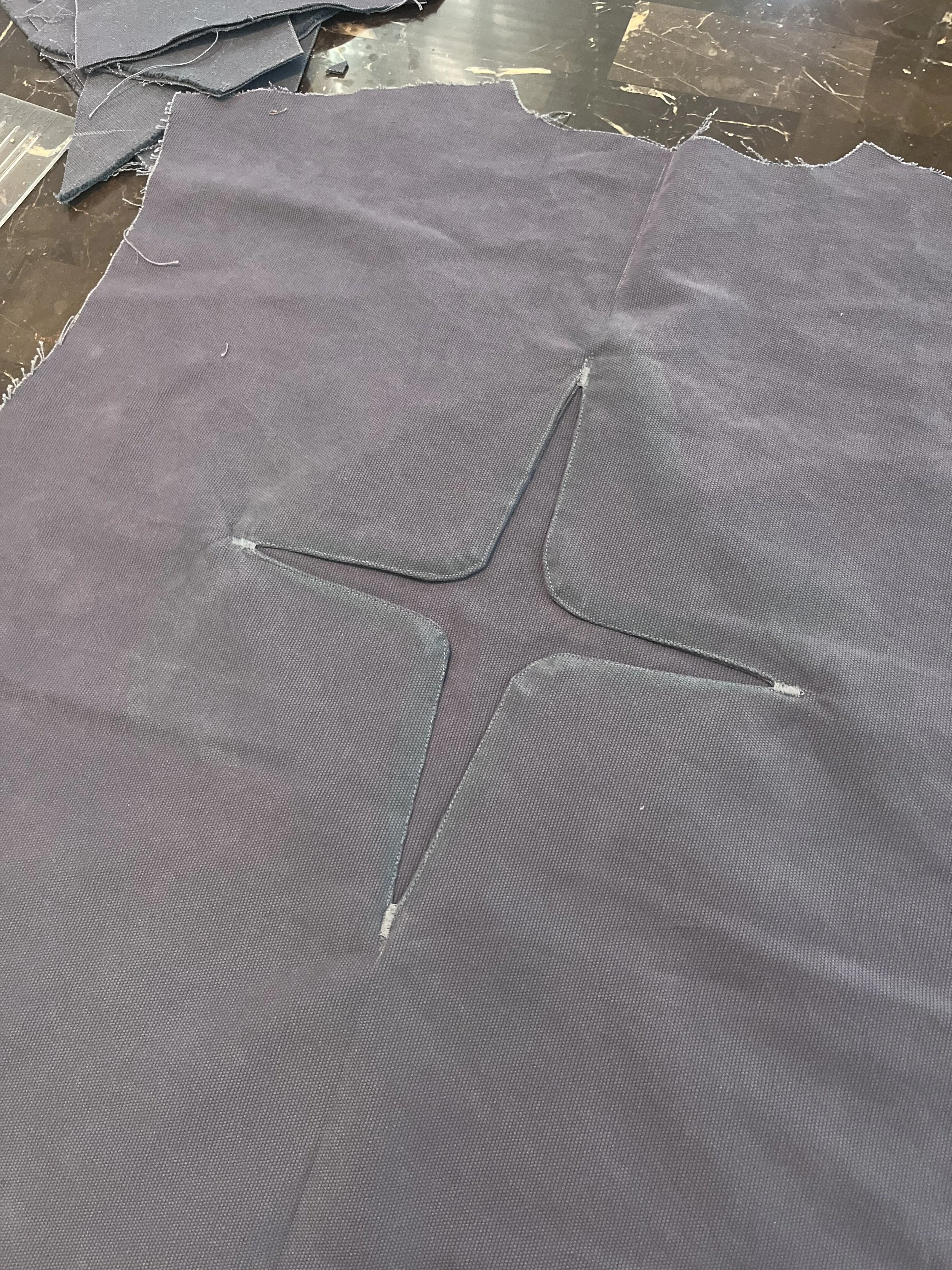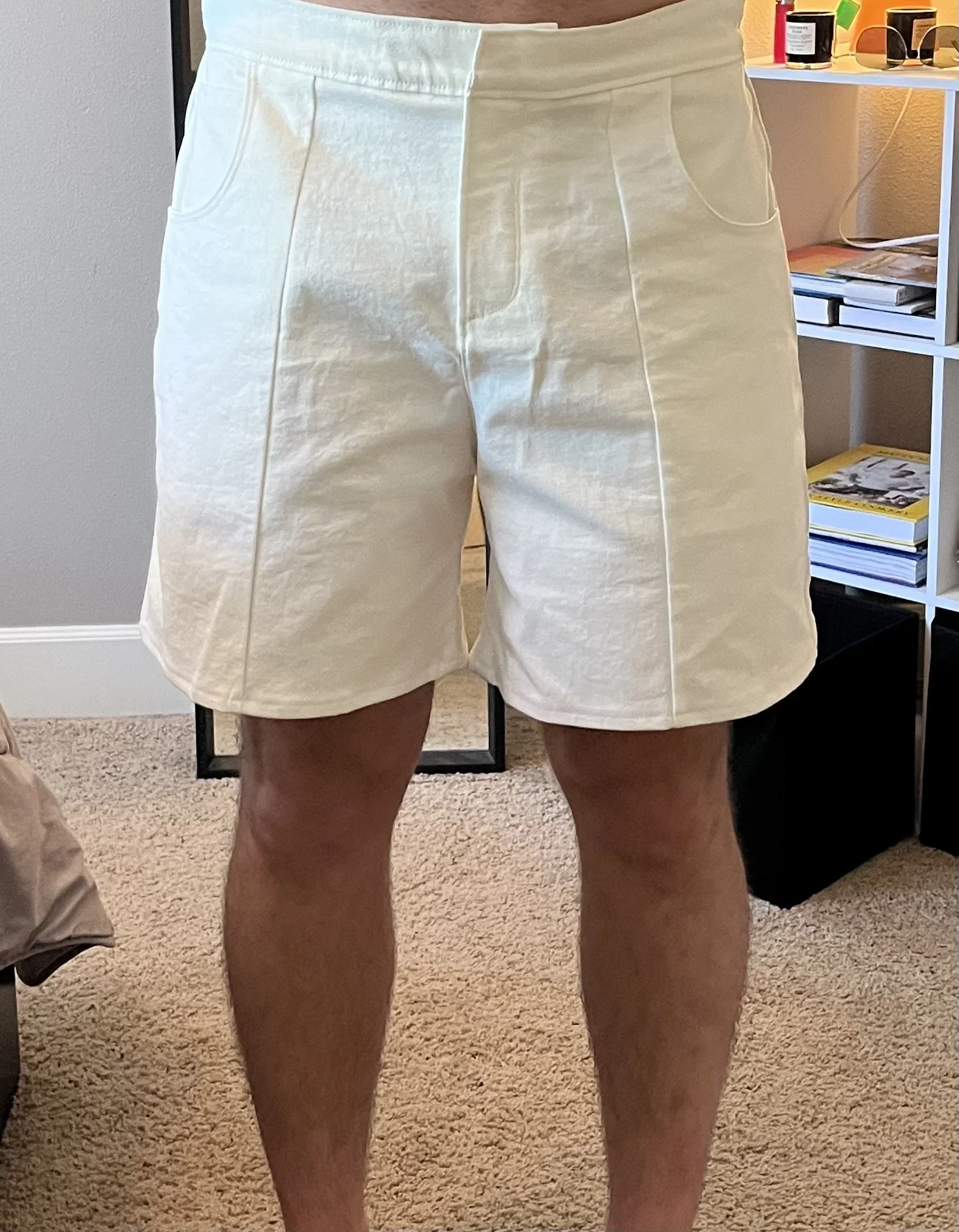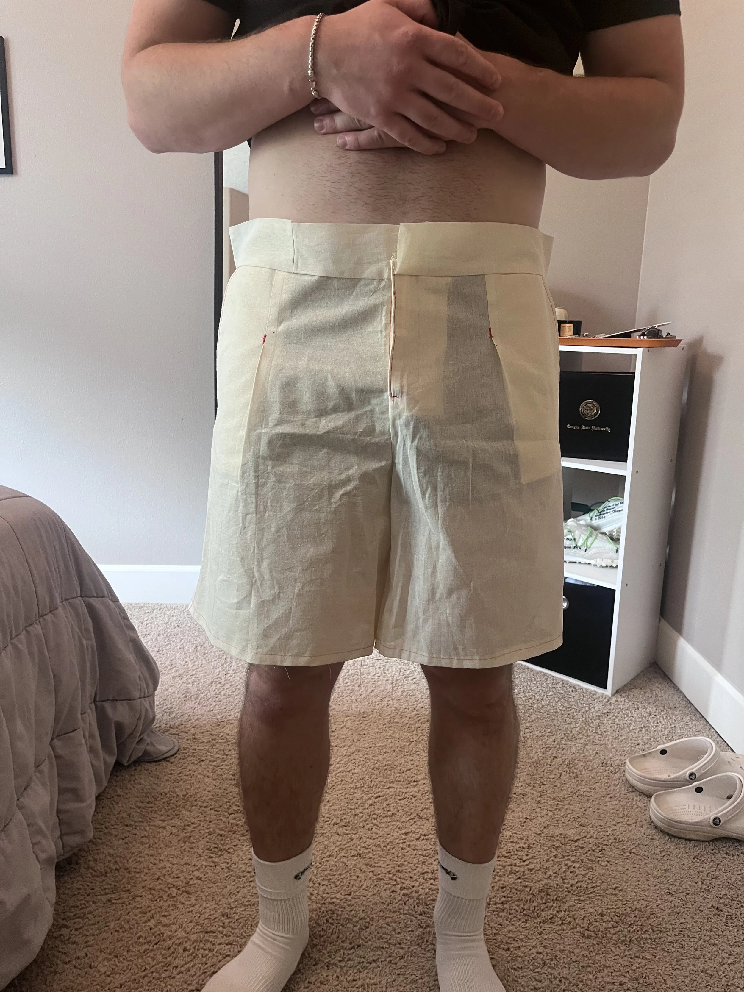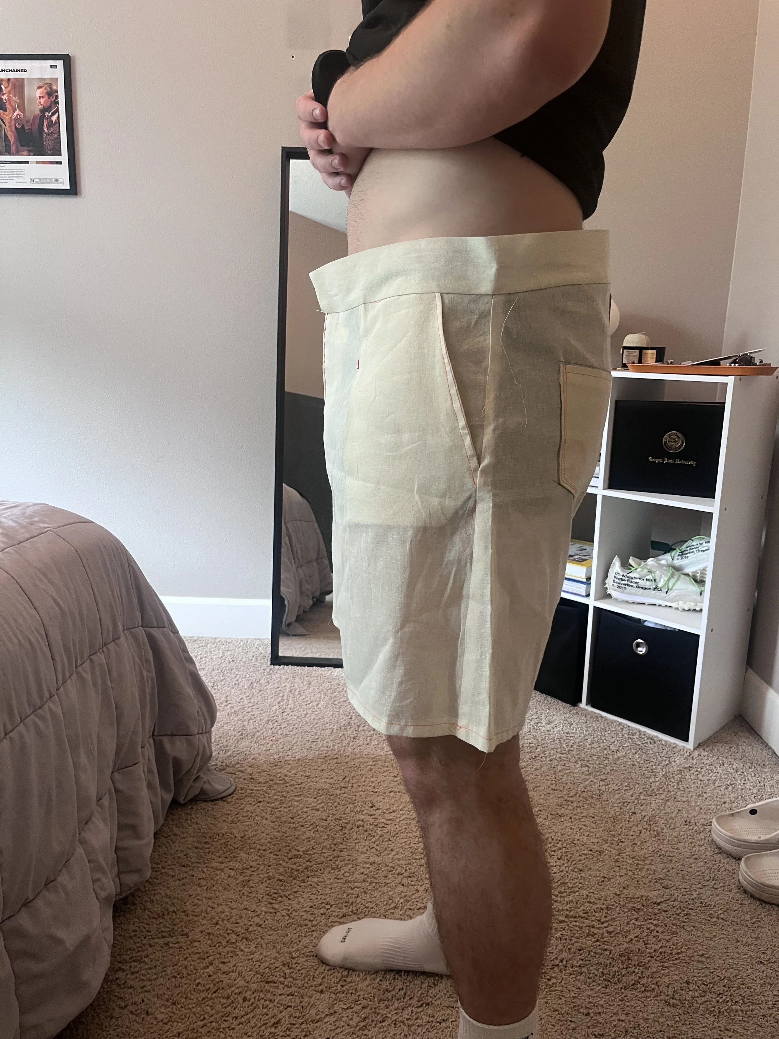 For the shorts, the main issue was the waistband, which was poking out and fitting loosely. We corrected this by curving the band pattern instead of keeping it straight. Another issue was excess fabric at the leg openings along both the inseam and outseam; I resolved this by tapering the pattern in by ½” on each side. Lastly, while the pockets functioned, the bag was too shallow and risked items not being secure. To address this, I added 2” of depth and reshaped the opening. Instead of a standard U-curve, which we found restrictive in competitor styles, I exaggerated the curve into a more circular shape and slightly enlarged the opening to create a more organic, accessible feel.