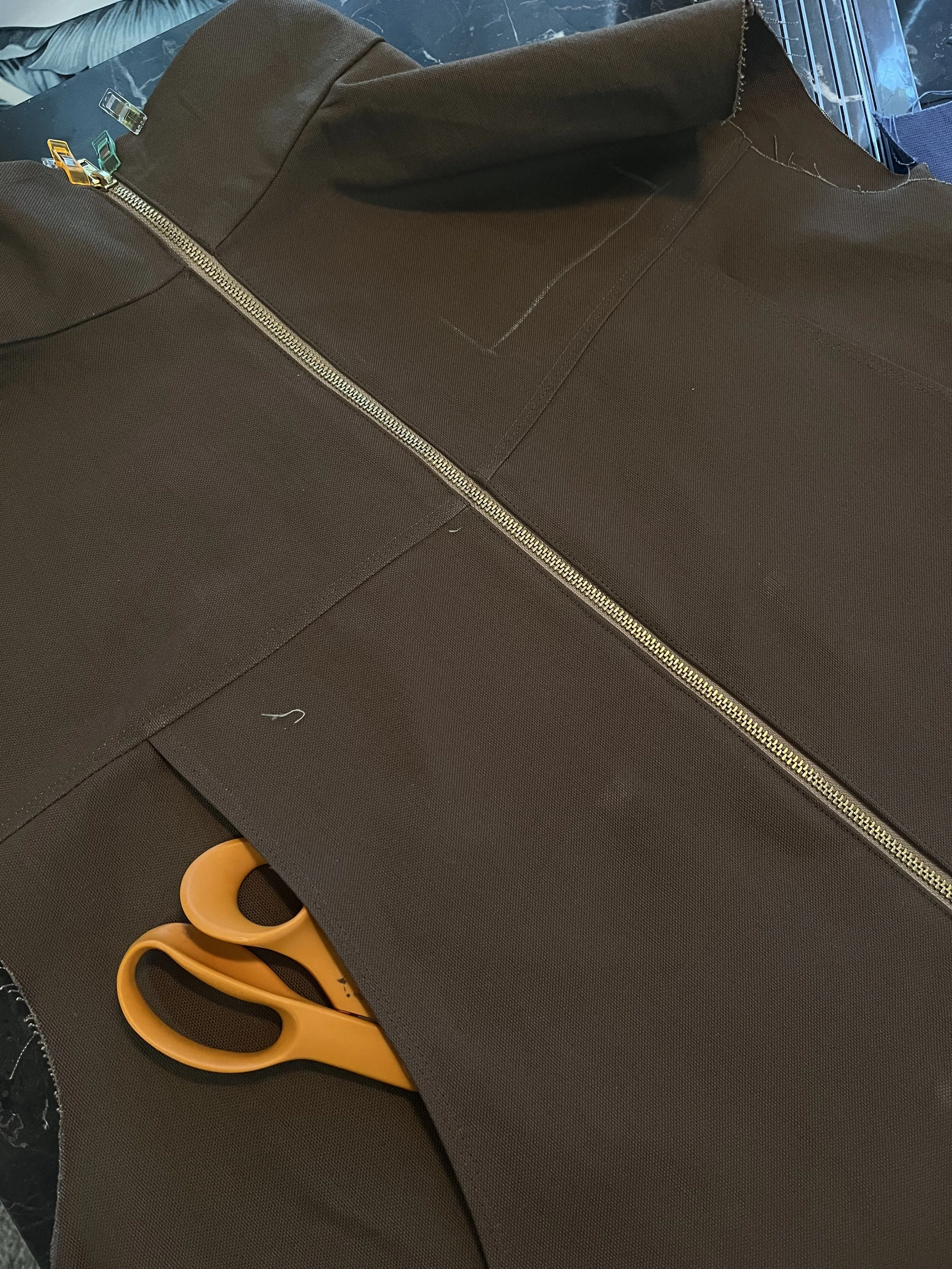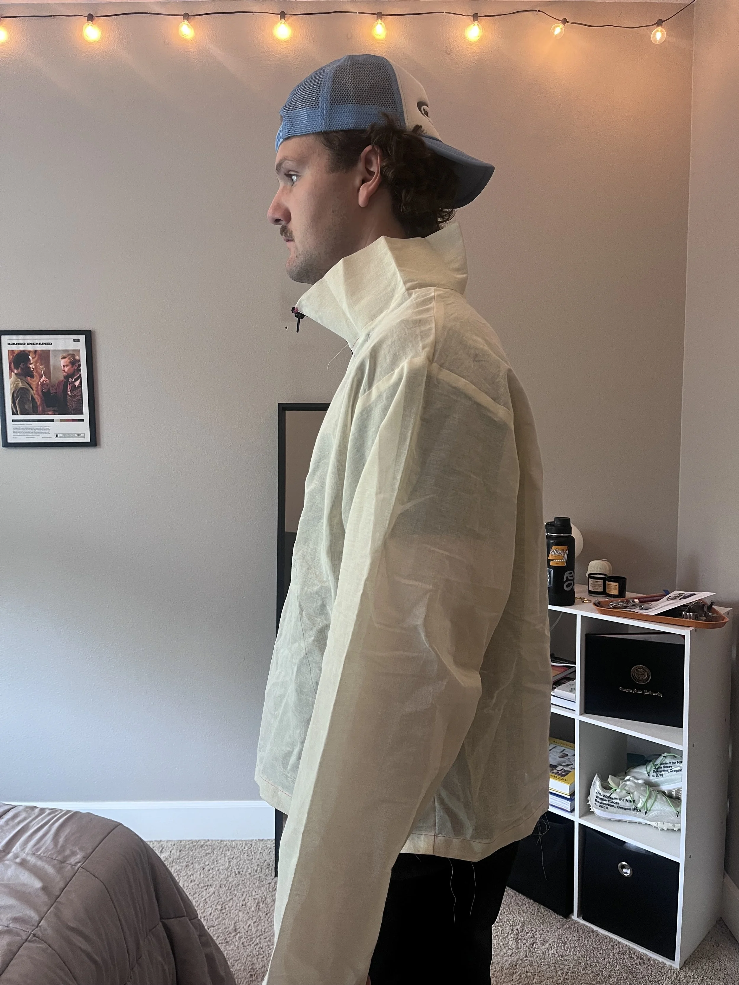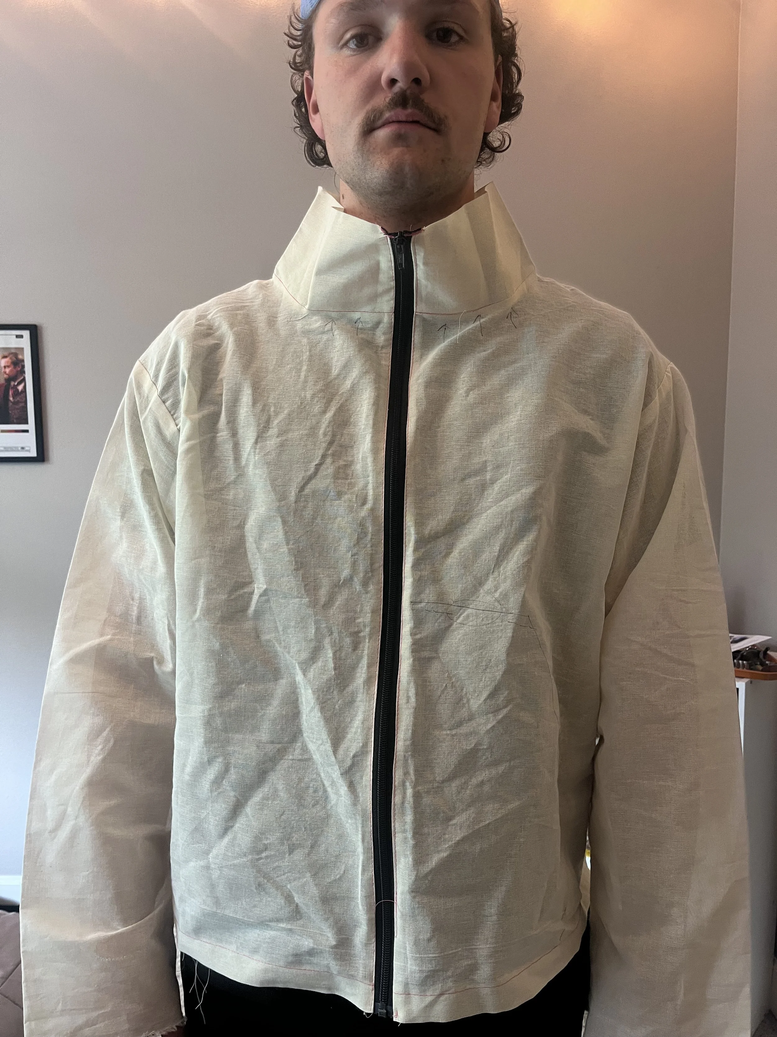 Conducted a fit session and identified several issues, including draglines at the armscye caused by incorrect sleeve-to-body fitting. This was corrected by adjusting the sleeve attachment and adding 1” of ease. The primary issue was in the neckline—on both samples, the mock neck was too wide, tall, and protruded outward. I addressed this by extending the shoulder length by 1” and raising the neckline by 1” to create a shallower, more balanced curve.